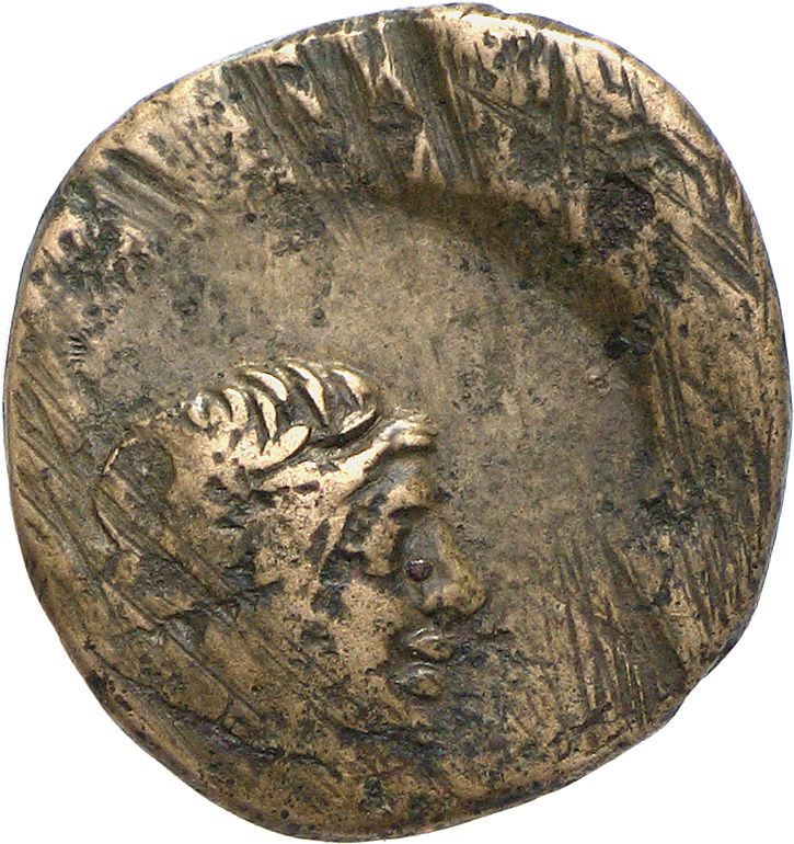 Überprägt auf eine Münze von Amisos (Vs. Behelmter Kopf der Ares, Rs. Schwert in Scheide), der Kopf des Ares ist auf der Rs. noch zu erkennen.